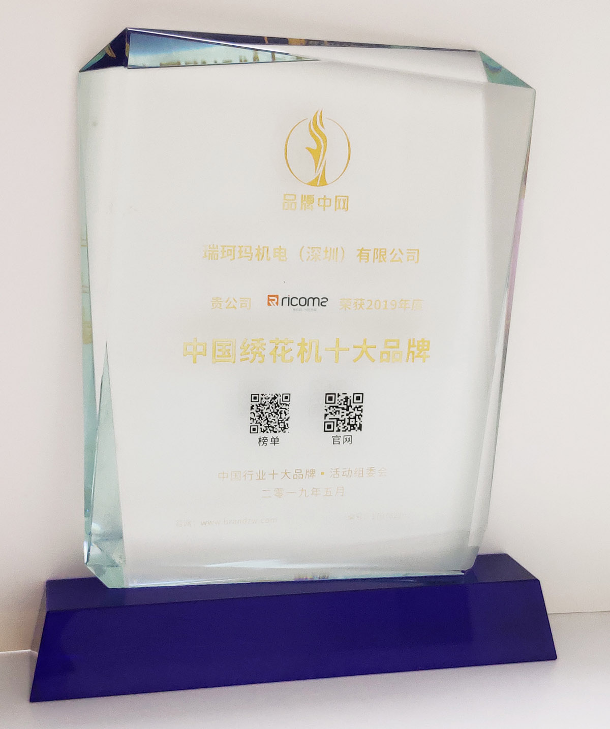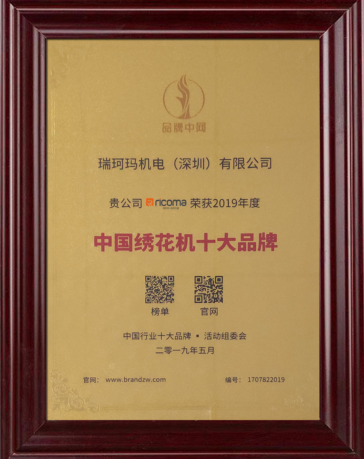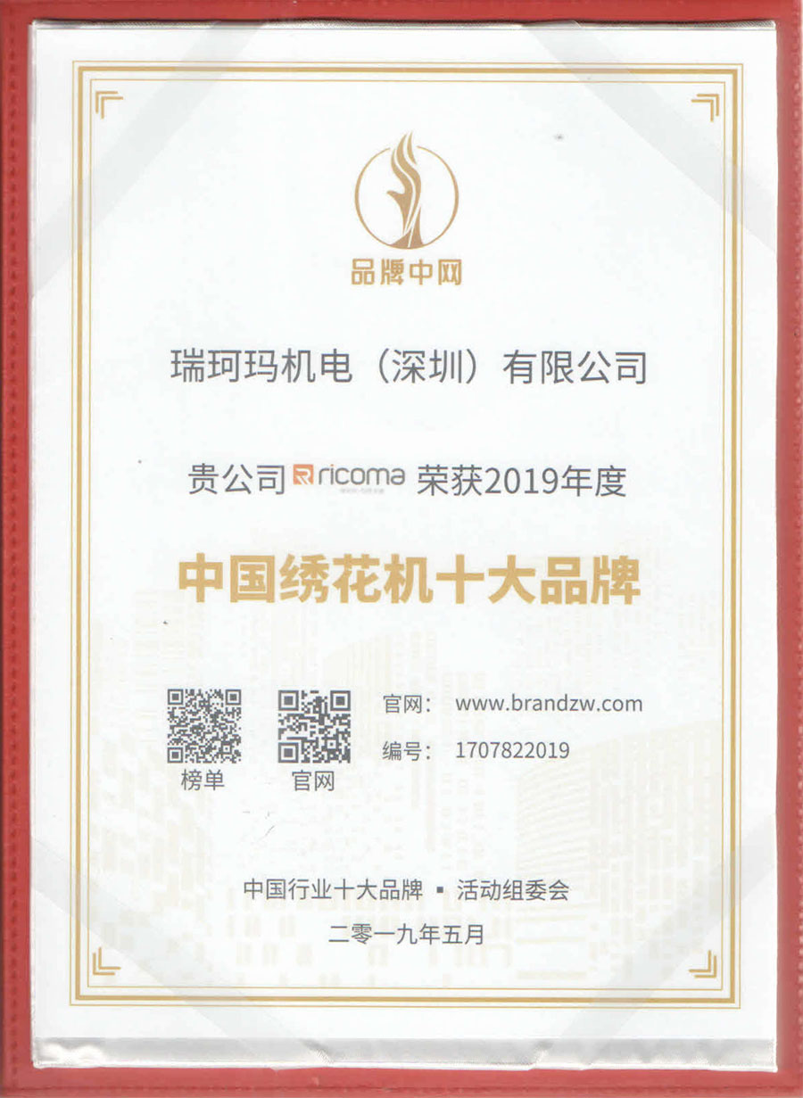 熱烈祝賀瑞珂瑪榮獲2019年度“中國繡花機十大品牌第一名”榮譽稱號