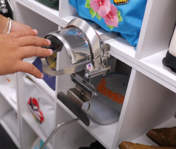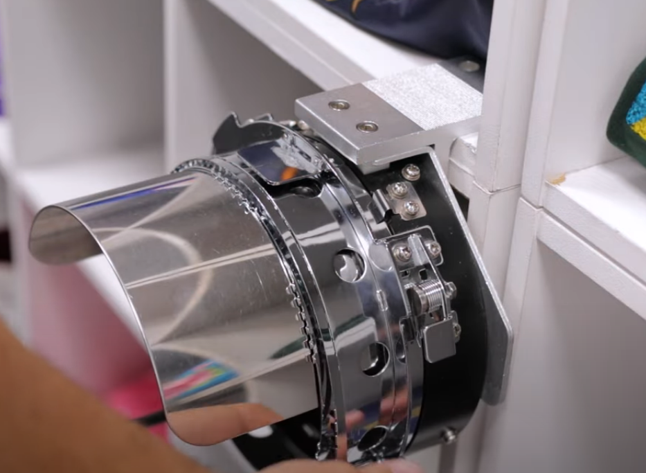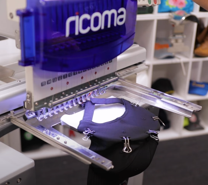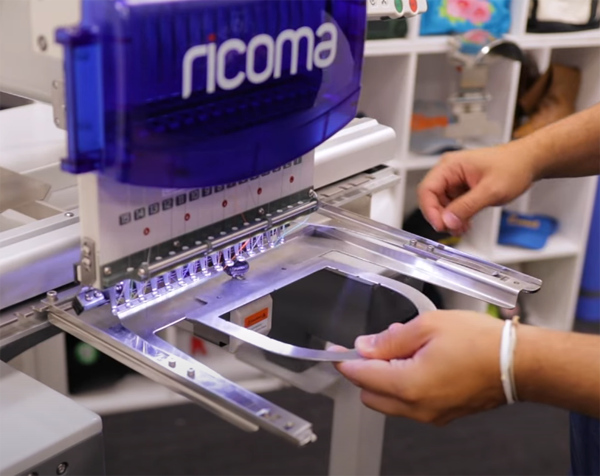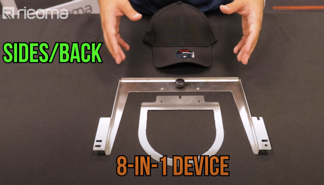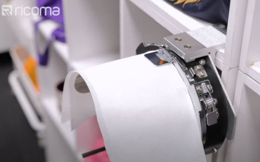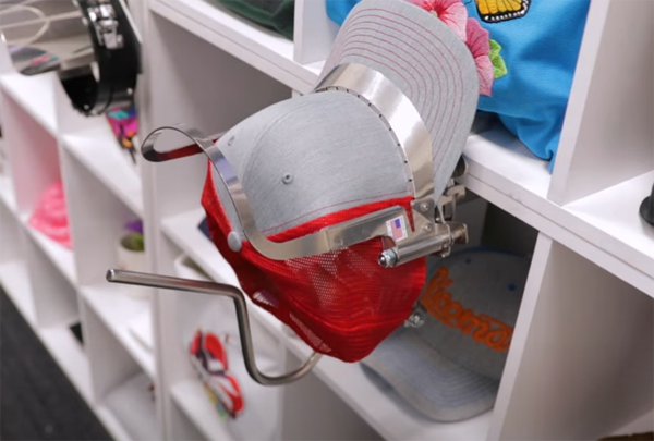 弧形裝置操作非常方便,只需要打開(kāi)框架,箍上帽子,合上框架,就可以將裝置插入機(jī)器,開(kāi)始刺繡。